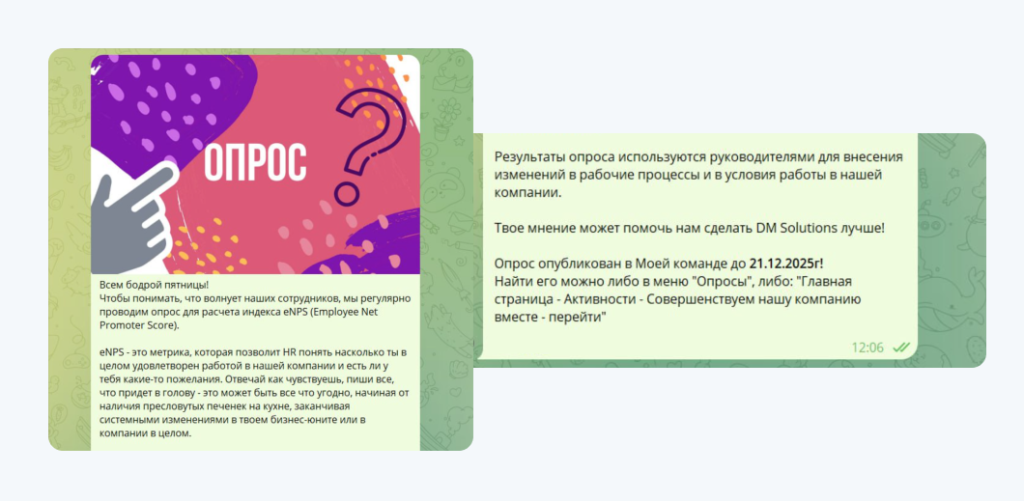 Плюсы:В этом году мы вывели использование опросов на совершенно новый уровень. Мы перенесли в них всё: от классического eNPS и оценки инструментов коммуникации до таких практических вопросов, как «У вас есть техника от компании?».
