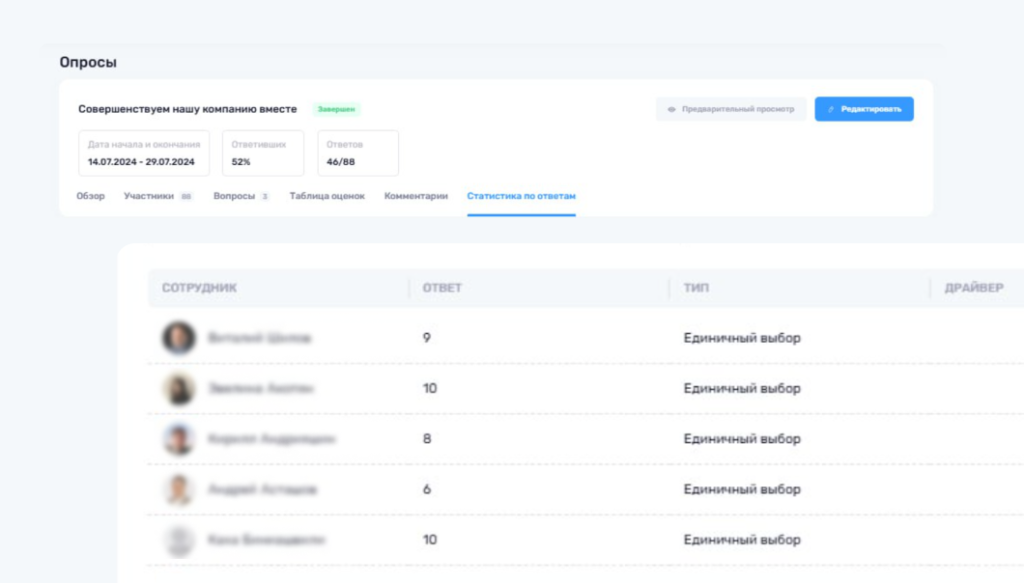 Автоматизация задач позволила увидеть полную картину происходящего в компании. Главную роль в этом сыграли два мощных инструмента: опросы и рекрутмент.Опросы: NPS как пульс компании и здоровье команд на визуальных дашбордах