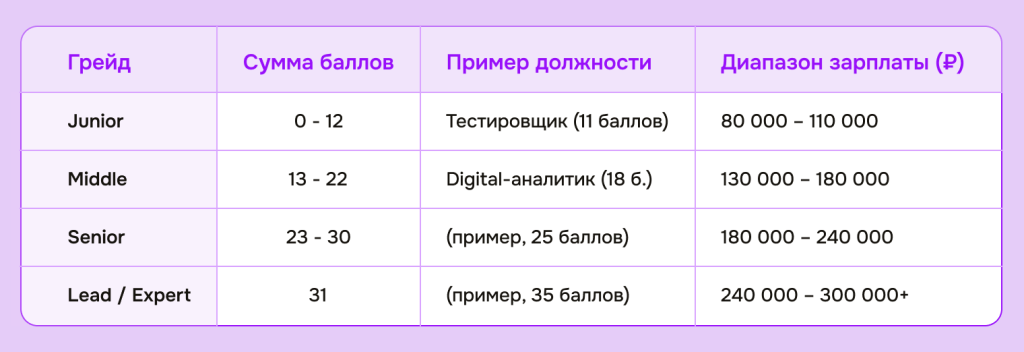 Каждому грейду соответствует вилка зарплат. Например, digital-аналитик с 18 баллами попал в Middle и теперь его зарплата устанавливается в диапазоне 130–180 тысяч рублей, в зависимости от опыта и результатов. Если тестировщик набрал только 11 баллов — он еще Junior, его ставка ниже, например 80–110 тысяч.