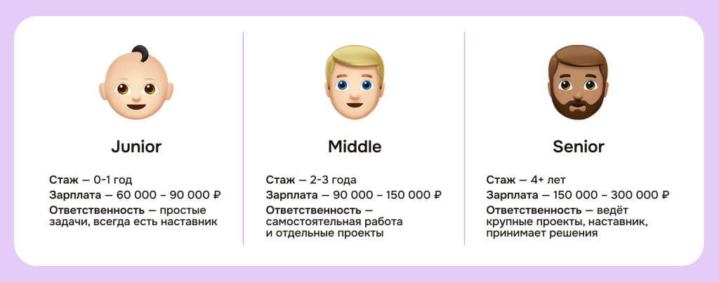 - Senior (Сеньор) — это опытный эксперт, который разбирается в деталях, способен вести большой проект, помогает коллегам и решает нестандартные задачи. Его ценят за умение брать на себя ответственность и за высокие результаты. Для такого уровня зарплаты начинаются примерно со 150 000 и могут доходить до 300 000 рублей.