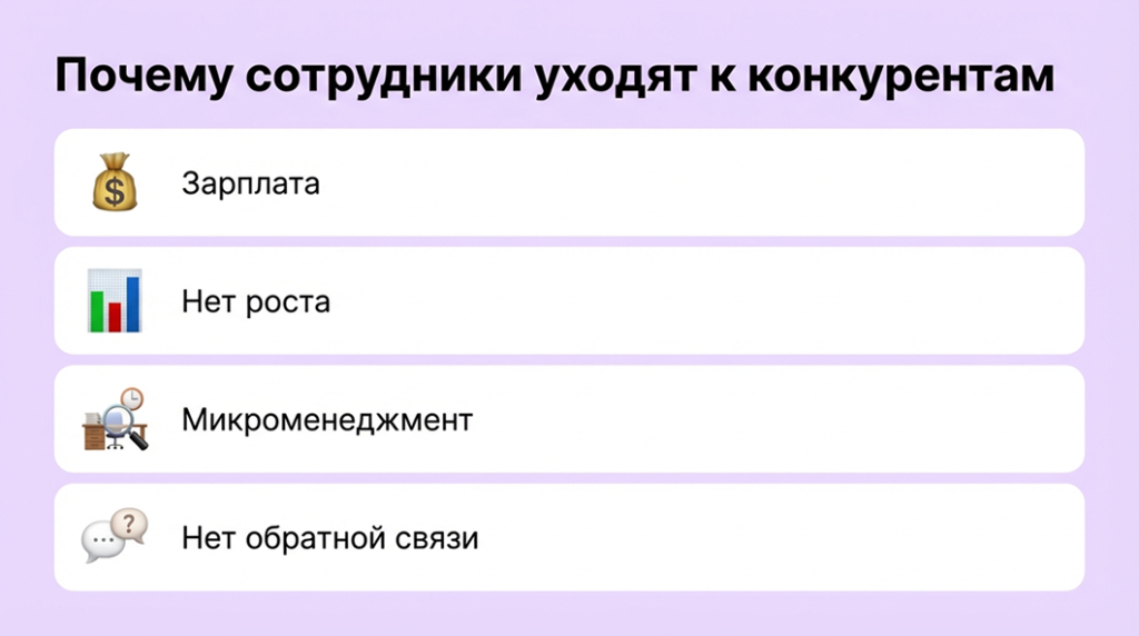 Токсичная среда, микроменеджмент и недоверие заставляют уходить даже при конкурентной зарплате. Если у сотрудника нет автономии и влияния, любой внешний оффер превращается в спасательный круг.4. Ловите сигналы до оффера