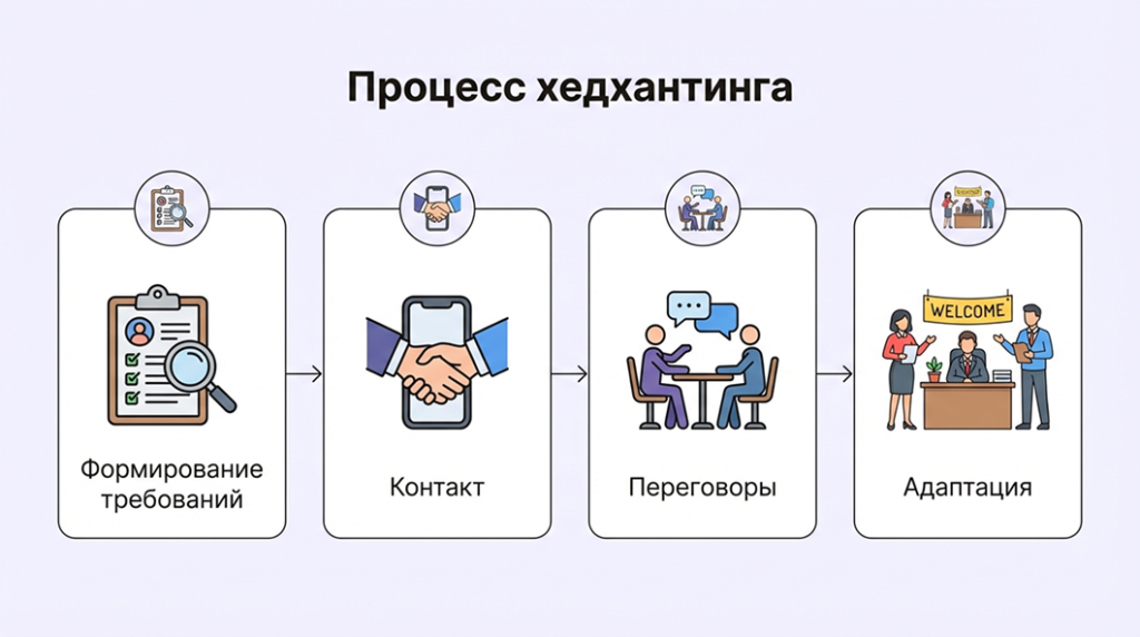 Когда определились с методом, следует подумать о том как развернуть процесс хедхантинга. Его можно разделить на 4 этапа: