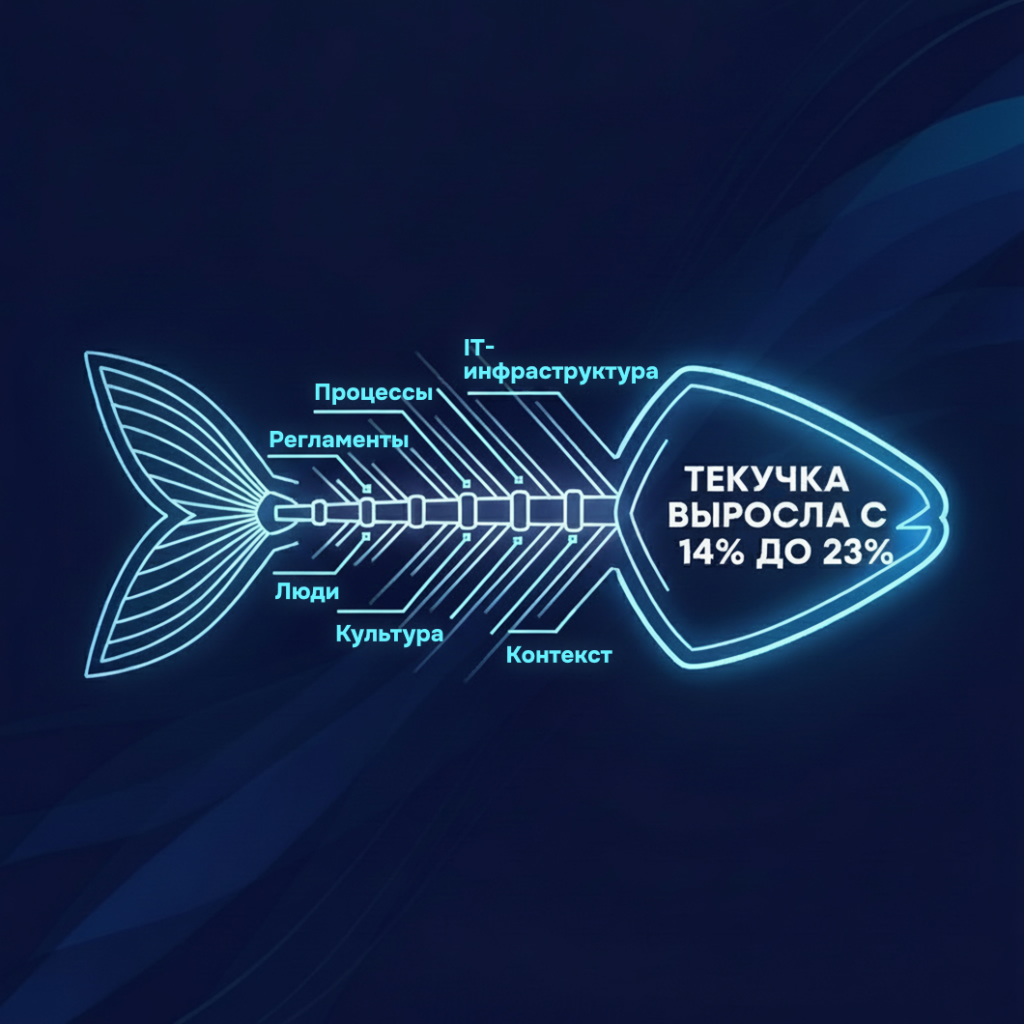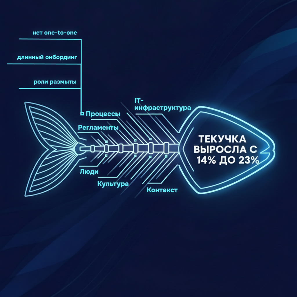 Не ищите одну главную причину. Исикава работает иначе: проблема — это связка факторов. Текучесть может быть следствием рынка, перегруза и слабого онбординга одновременно.