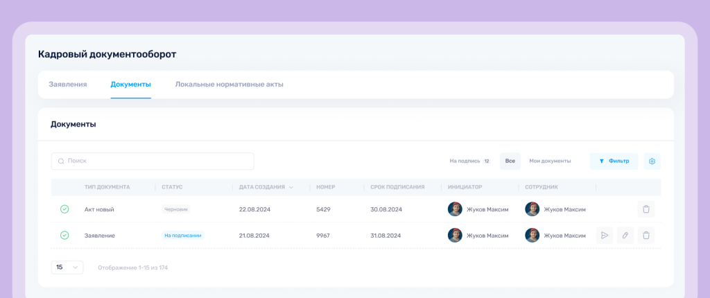 Все этапы жизненного цикла документа — от создания до подписания и архивации — фиксируются в системе. Это обеспечивает абсолютную прозрачность кадровых процессов и упрощает внутренний аудит. КЭДО бесшовно интегрирован во все основные HR-процессы внутри «МояКоманда»: от приема сотрудника на работу до его увольнения. Все данные синхронизированы, что создает целостную и управляемую экосистему.