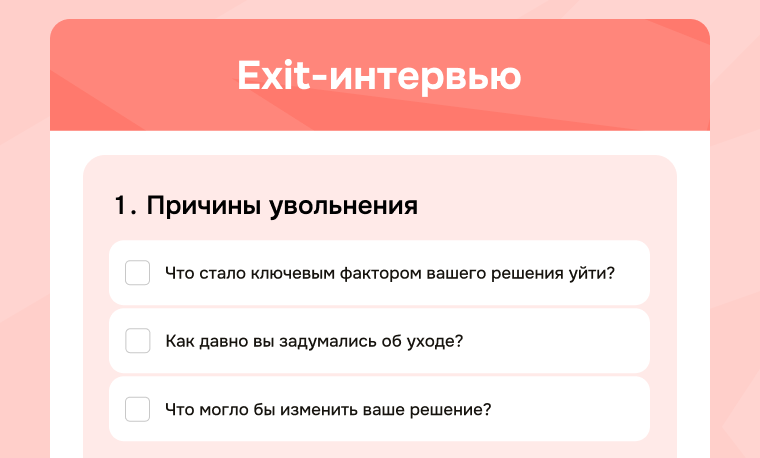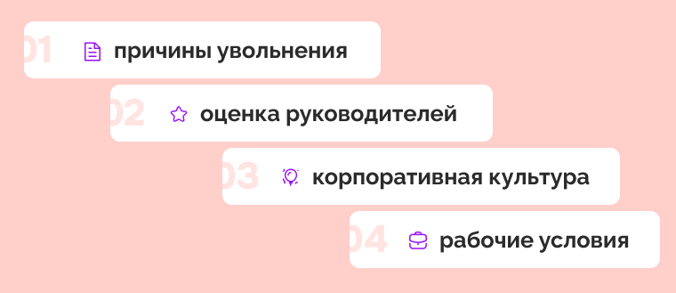 Для получения глубокой и честной обратной связи вопросы стоит разделять на тематические блоки:Причины увольнения