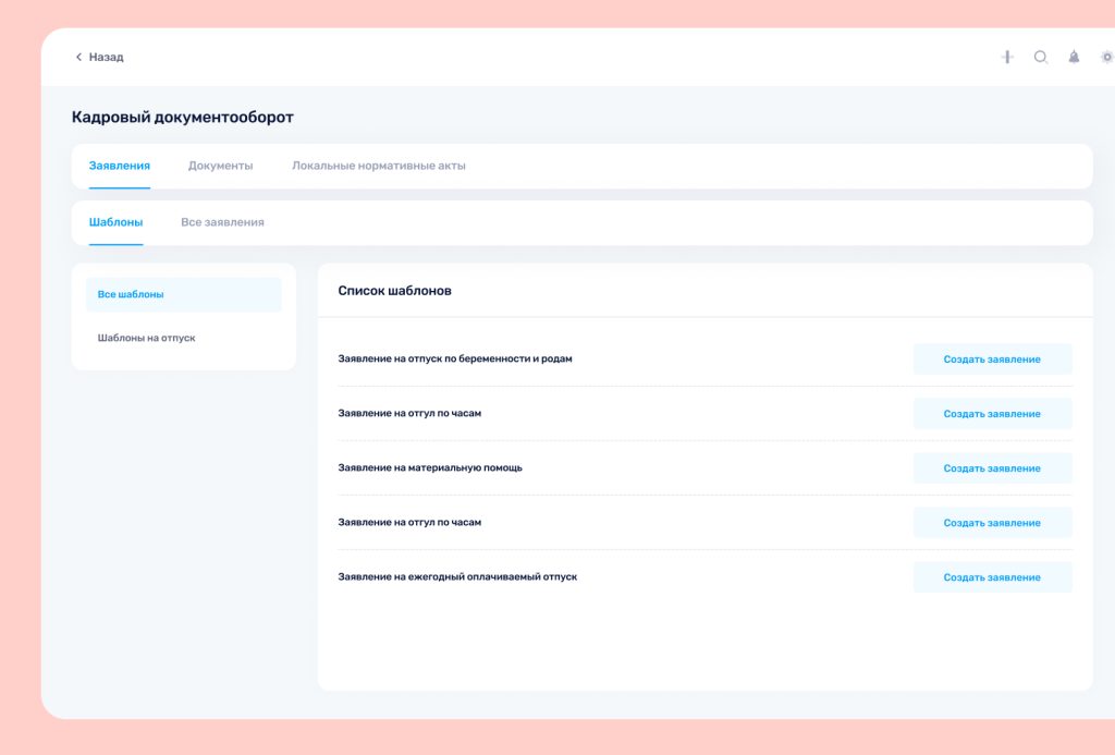 Шаг первый: выберите нужный шаблон. Если вы организуете КЭДО на комплексной платформе, там должны быть загружены разнообразные шаблоны. Это здорово экономит время HR-специалиста: просто сгружаете все типовые документы с разных процессов, а потом выбираете необходимый.