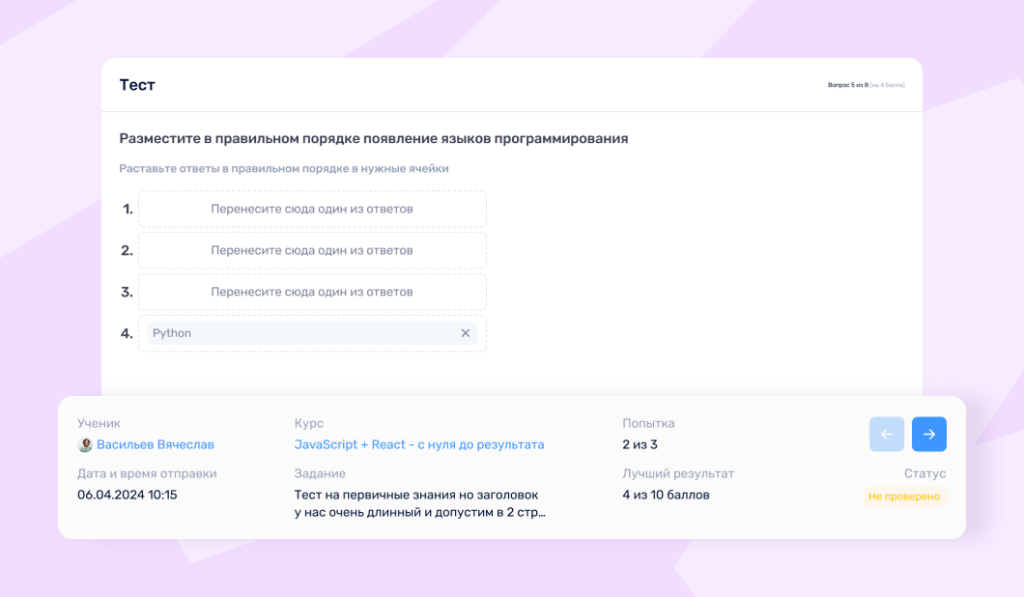 Доходимость до конца обучения. Считается просто: сколько сотрудников начали обучение и сколько дошли до финала. Если из 100 человек курс завершили 60, доходимость — 60%. Низкий показатель обычно говорит о том, что обучение неудобно встроено в работу, перегружено или не выглядит полезным.Процент выполненных заданий. Здесь смотрят, сколько обязательных заданий реально выполнено. Например, если в курсе 10 заданий, а в среднем сотрудники выполняют только 6, это сигнал, что либо не хватает времени, либо задания кажутся неочевидными или оторванными от практики.