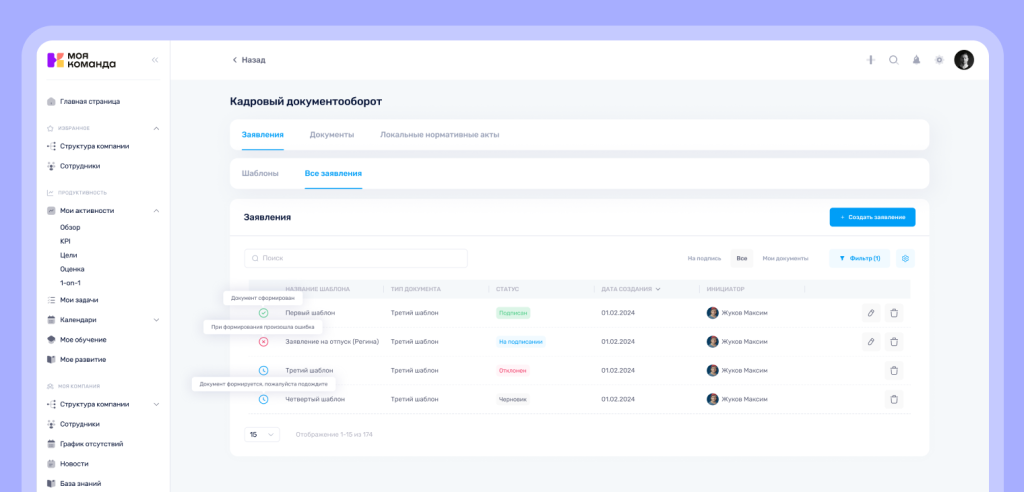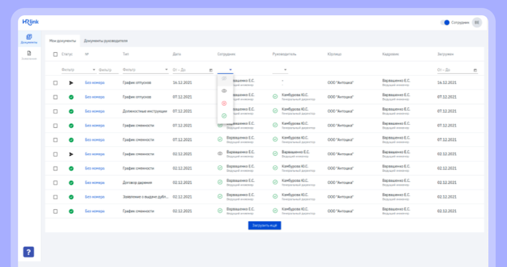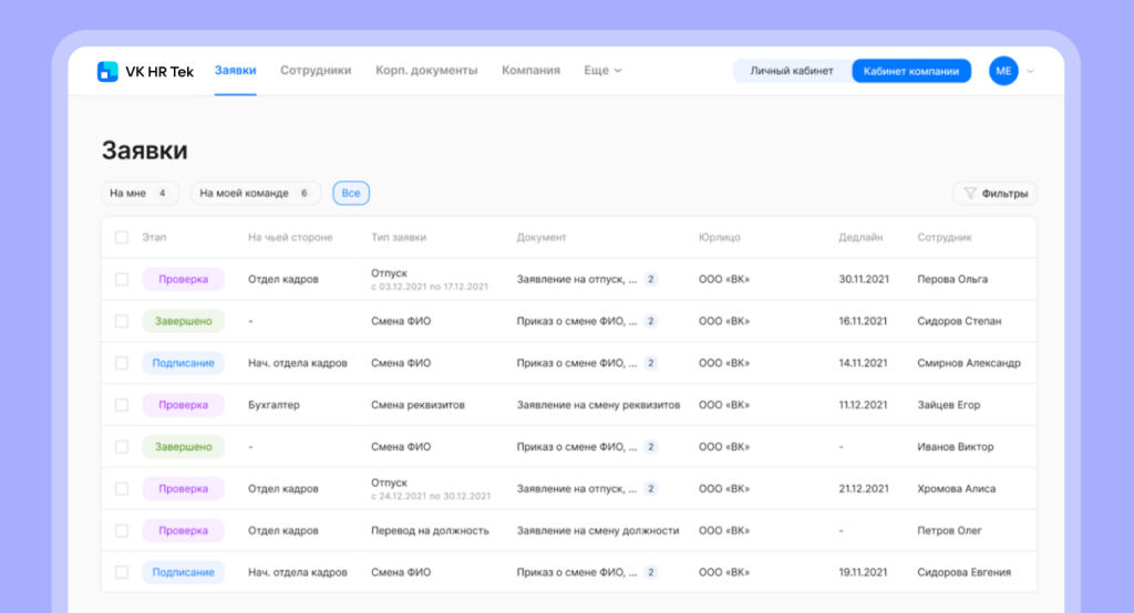 - Удобный кабинет сотрудника, где собраны все его документы и заявки