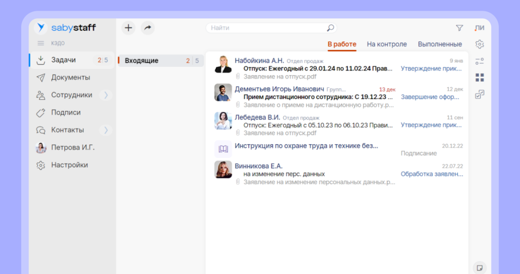 Экономия времени. Подпись ставится онлайн за несколько минут. Время на рутинные задачи кадровиков сокращается до 70%. Заявление на отпуск согласуется за два дня вместо недели, а договор можно оформить в тот же день.