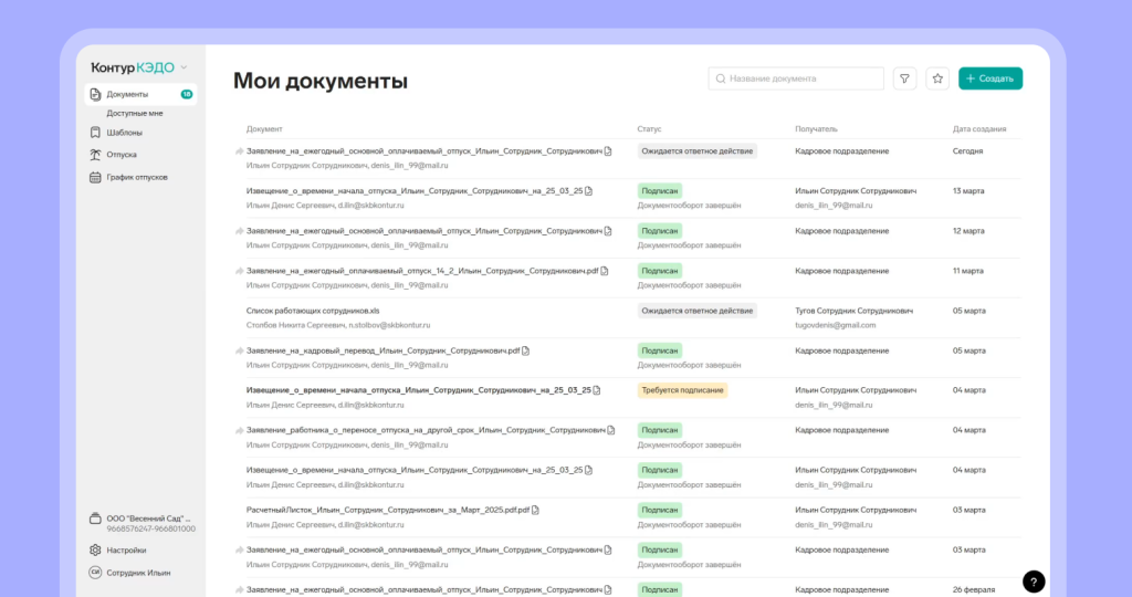 Онлайн-сервис, который переводит кадровые процессы в цифровой формат. Через платформу можно готовить, подписывать и хранить документы без бумажных архивов. У «Контура» есть собственный удостоверяющий центр, поэтому электронные подписи сотрудникам выпускаются прямо через сервис.Возможности: