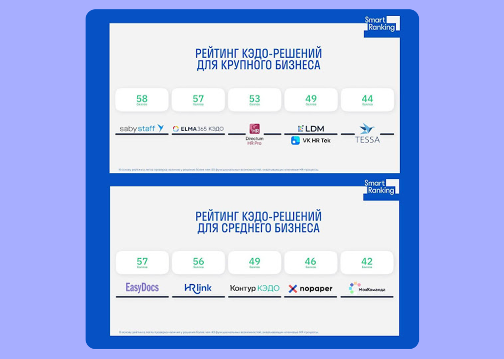 «МояКоманда» отмечена в рейтинге Smart Ranking среди современных КЭДО-решений для бизнеса. Это значит, что сервис уже занимает свое место на рынке и развивается в одном ряду с крупными игроками. Главное преимущество в том, что система позволяет полностью перевести кадровые процессы в цифру: документы оформляются онлайн, подписываются за минуты и удобно хранятся в системе.