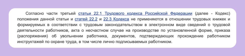 Выдержка из Статьи 22.1 ТК РФ, которая касается приказа об увольнении. Источник