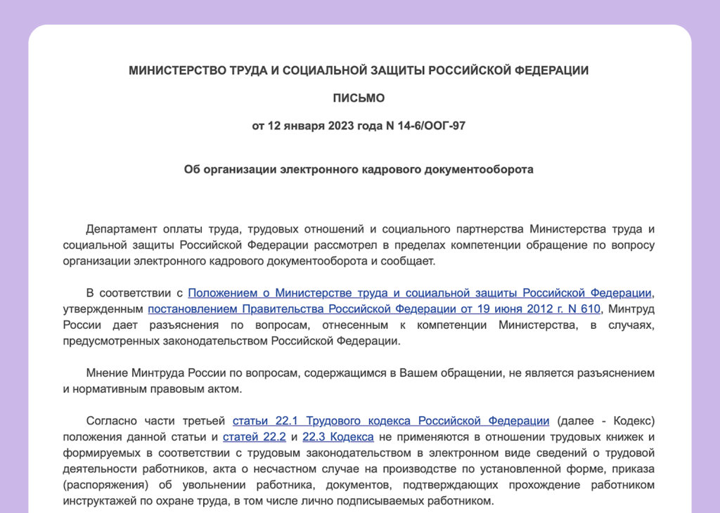 Письмо Минтруда об организации электронного кадрового документооборота. Источник