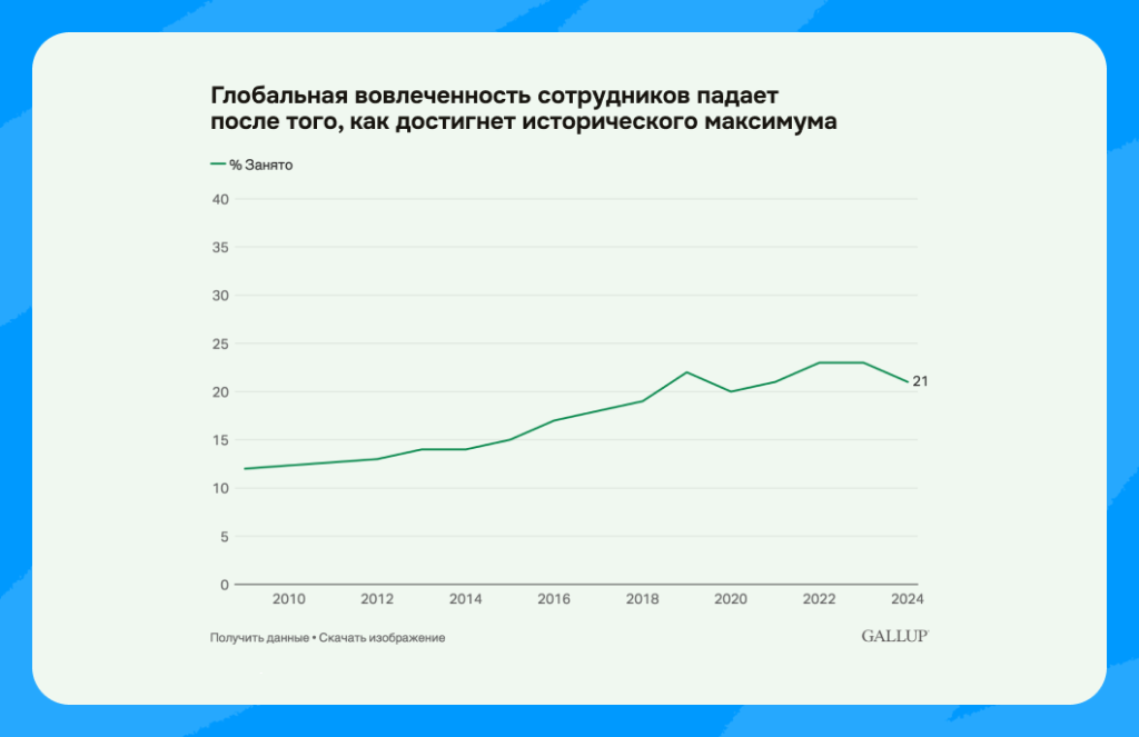 Цифры говорят сами за себя. Глобальная вовлеченность сотрудников упала на два пункта до 21% в прошлом году, при этом потеря производительности обошлась мировой экономике в 438 миллиардов долларов.